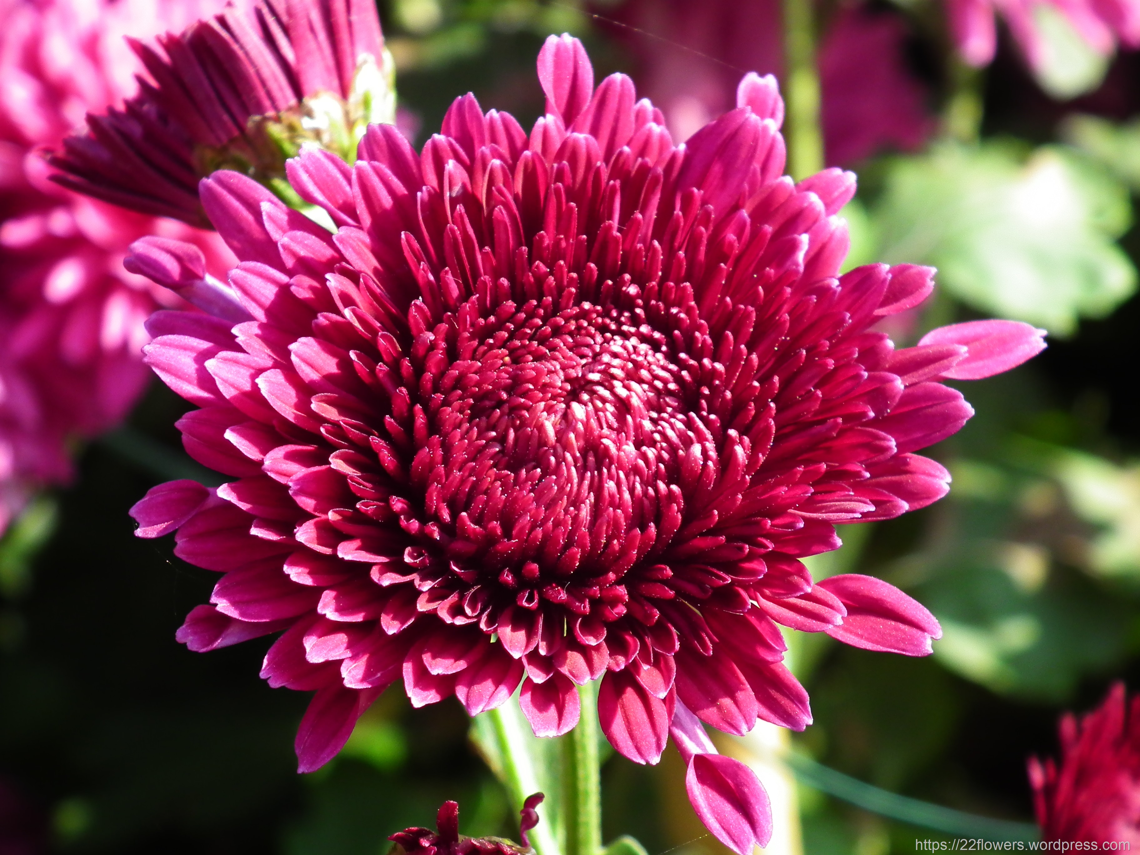 Wild Chrysanthemum taxa are herbaceous perennial plants or subshrubs. They have alternately arranged leaves divided into leaflets with toothed or occasionally smooth edges. The compound inflorescence is an array of several flower heads, or sometimes a solitary head. The head has a base covered in layers of phyllaries. The simple row of ray florets are white, yellow or red; many horticultural specimens have been bred to bear many rows of ray florets in a great variety of colors. The disc florets of wild taxa are yellow. The fruit is a ribbed achene.